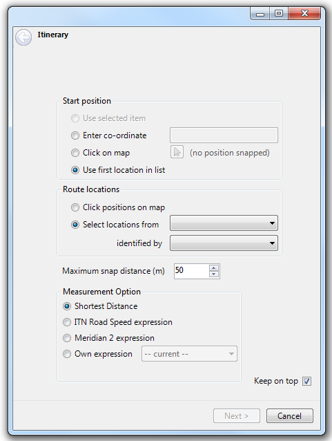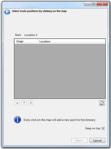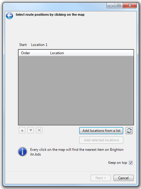 The second page of the Itinerary command, the Select route positions by clicking on the map dialog, will list the locations to be visited. This option allows you to specify the start point to be the first location on that list.