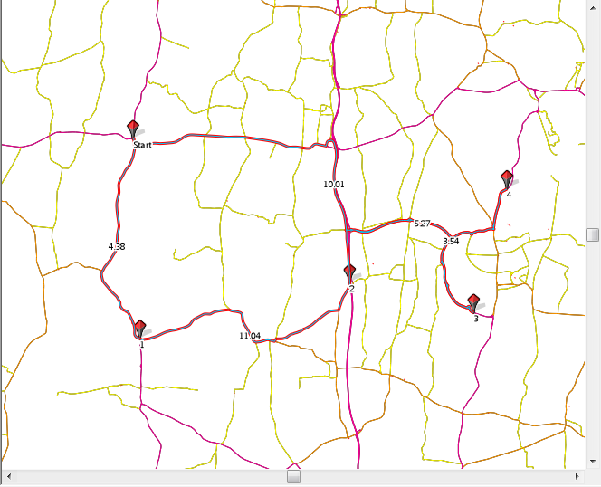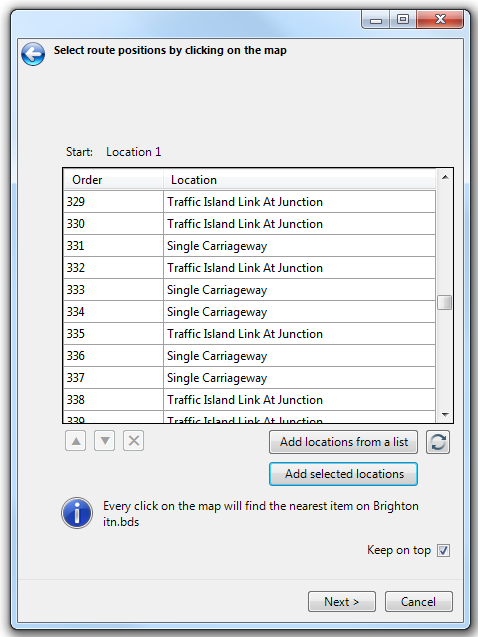 Added selected locations will only be active if more than one item was selected when the Itinerary command was started. This will add all of the selected items on the locations overlay to the itinerary. The Select route positions by clicking on the map dialog will be loaded with these locations, i.e.:
