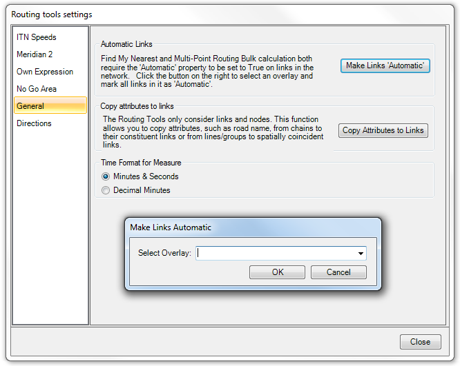 This indicates that the links in the topological network have not been set. Later versions of the ITN manager will do this automatically but older versions will require you to make this setting manually. Settings are fully covered in the Settings topic but the Make Links 'Automatic setting, which is required here, is shown below.