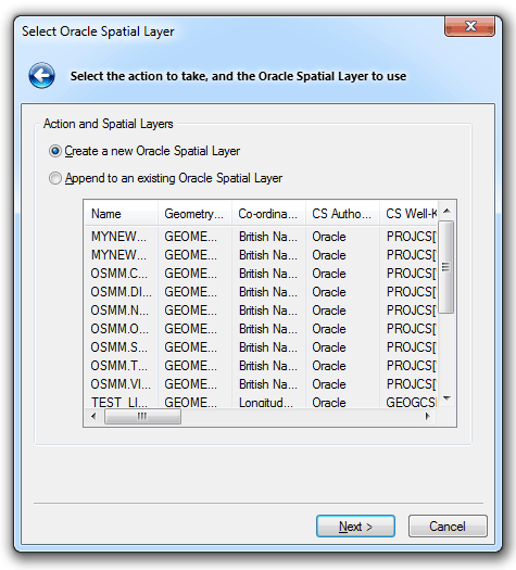 If you selected Append to an existing Oracle Spatial Layer select the existing layer from the list in the Select Oracle Spatial Layer dialog, and click Finish.