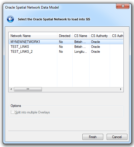 Select the Oracle Spatial Network to load into SIS and click Finish.