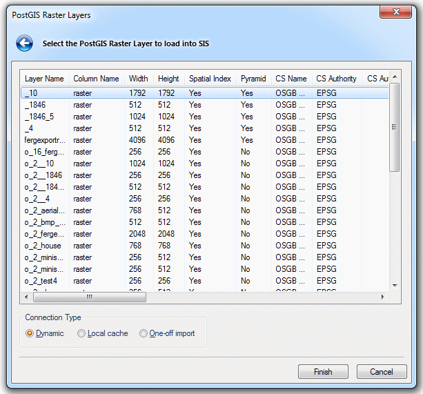 The PostGIS Raster Layers dialog will be displayed, showing the PostGIS Raster Layers available for loading into SIS.