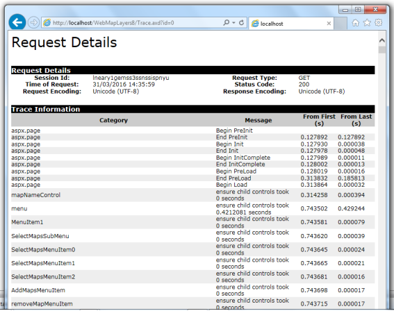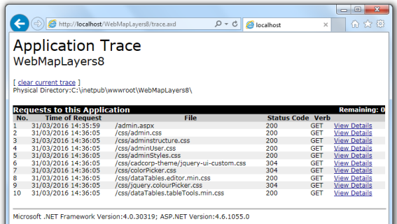 Note: You should refresh the trace.axd page when you go from the Admin page to the Map page to ensure the information shown is current.