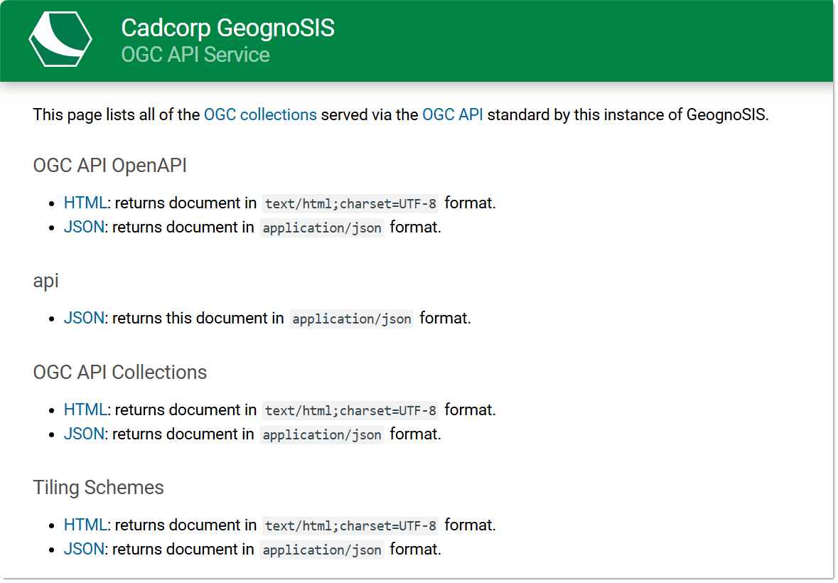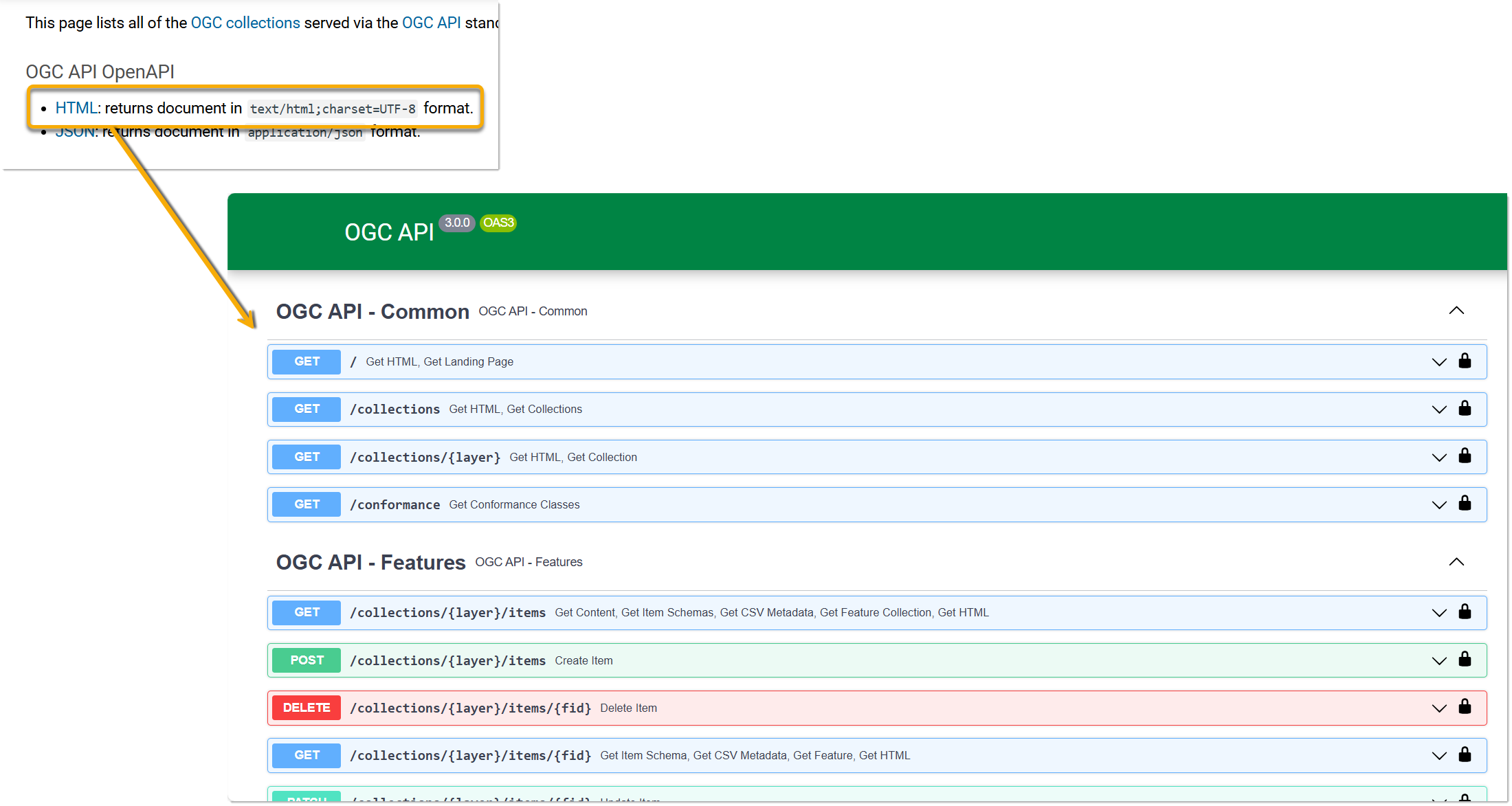 To try out the various API methods, click the first link HTML on the documentation page. This will direct you to a page where you can try API methods that are common to all three OGC API types: Features, Maps and Tiles.