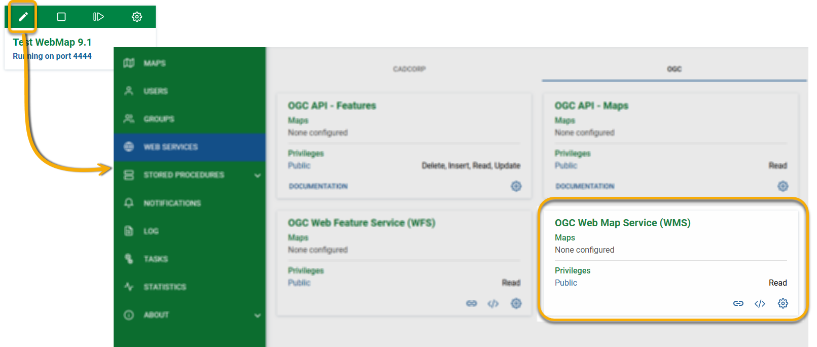 Click Edit on an instance and select Web Services > OGC > Web Map Service.