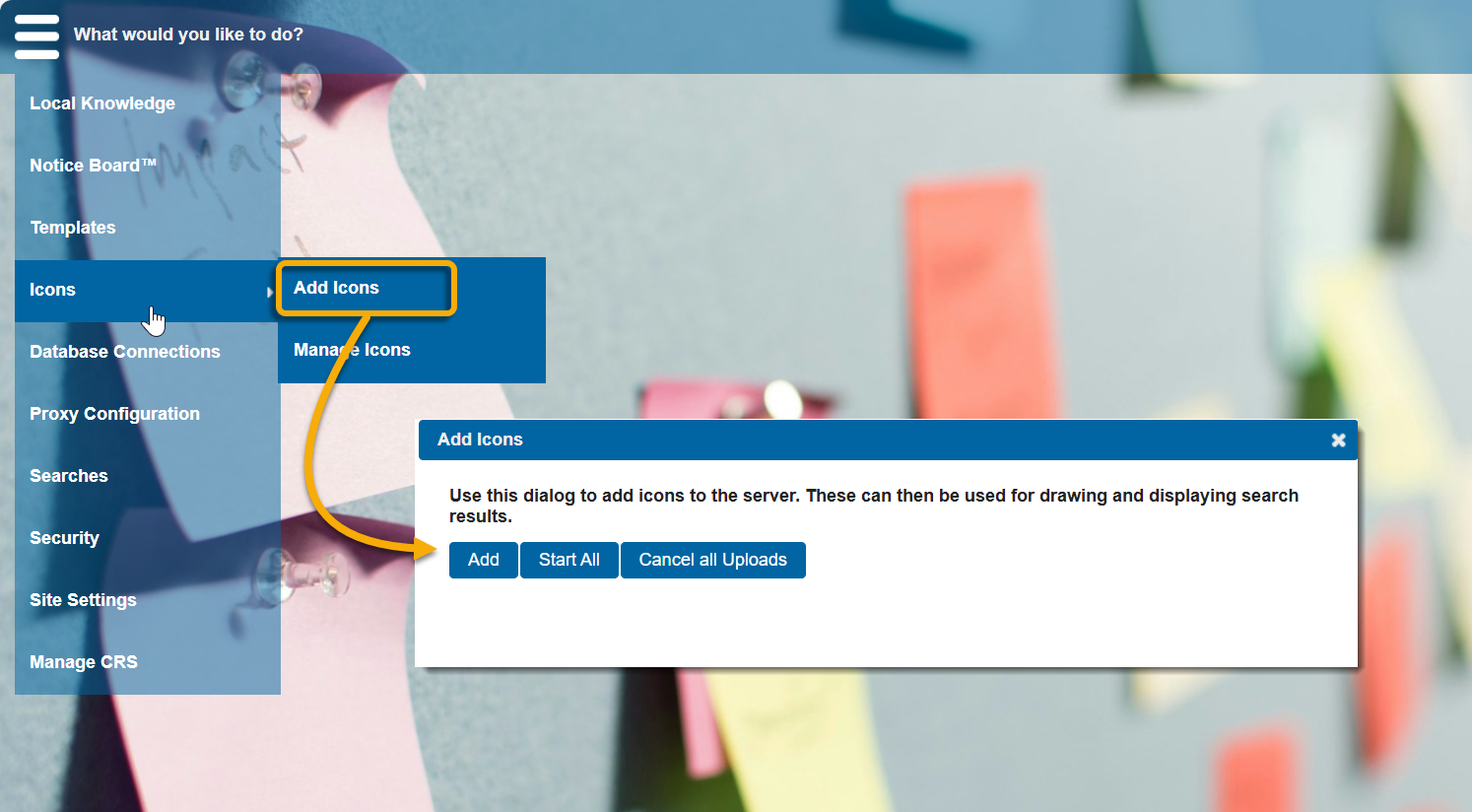 To use custom icons for Notice Board displays, add them as images to the config database.