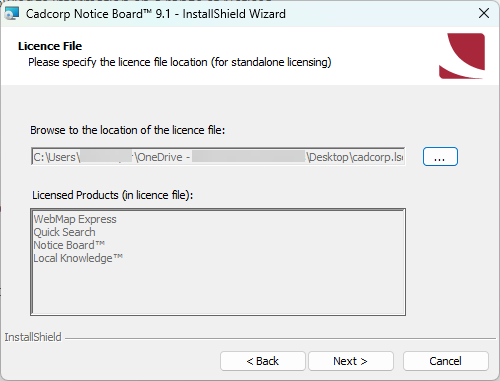 - In the next window, you will be asked for licensing details. Click the … button to navigate to the location of the licence file. Click Next.
