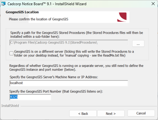 - This window shows the installed GeognoSIS Location (specifically the default location for the Stored Procedures.)