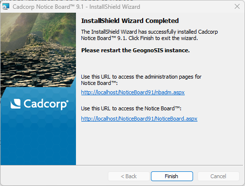 - Once successfully installed, you will see the URLs where Notice Board 9 has been installed. Use these URLs to open Cadcorp SIS Notice Board.
