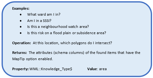 For example if the coordinates used in the Local Knowledge search falls within the polygon with the attributes shown in the Schema table, it would result in the following returned results: