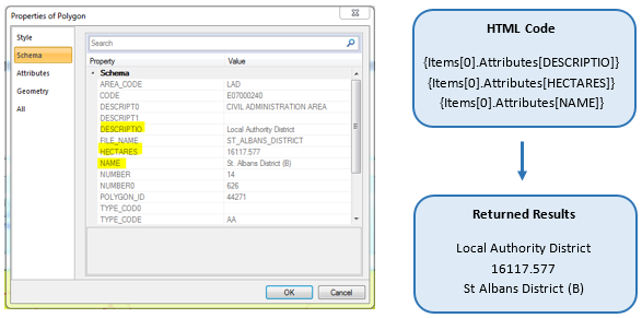 The information returned is defined by the HTML, in the schema above MapTips were ticked for DESCRIPTIO, HECTARES and NAME. These can be referenced with the following notations: