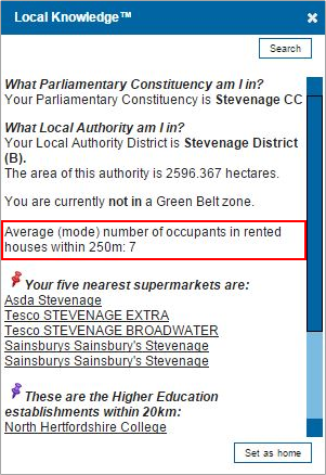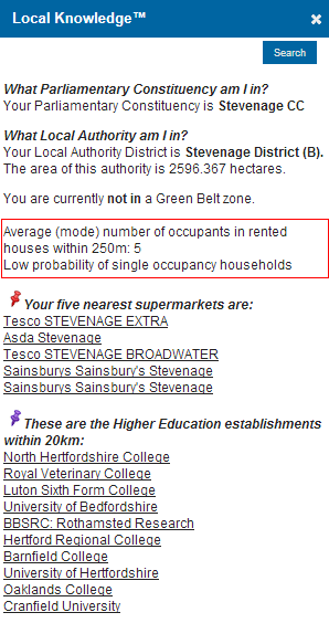 Consider for example if the user carries out a survey on people living alone in rented property, this value could give a preliminary indication of whether it is worth visiting the area to carry out research.