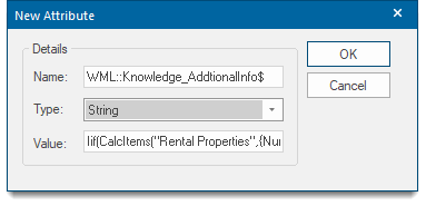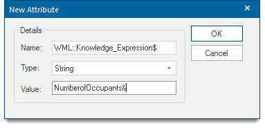 In the New Attribute dialog, type WML::Knowledge_Expression$ into the Name field. This property identifies the overlay column on which the expression will be executed: