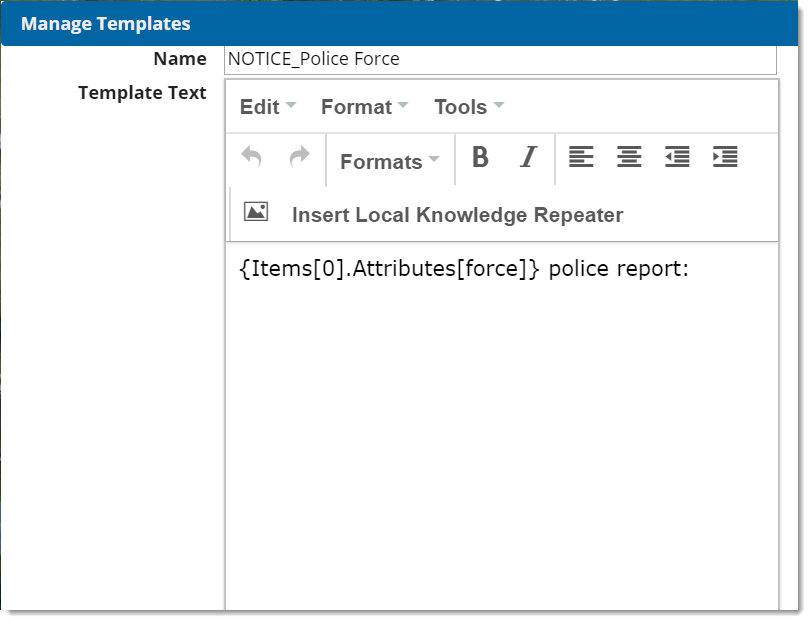 - From the Manage Templates dialog scroll to find NOTICE_Police Force.