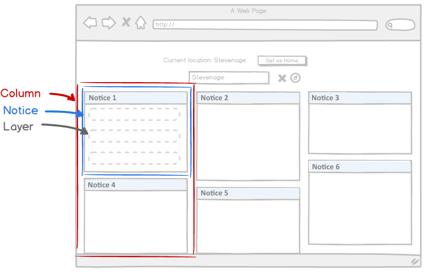 Columns, Notices and Layers form the essential building blocks of a Notice Board page. These display units are created and arranged using the Notice Board Admin Interface.
