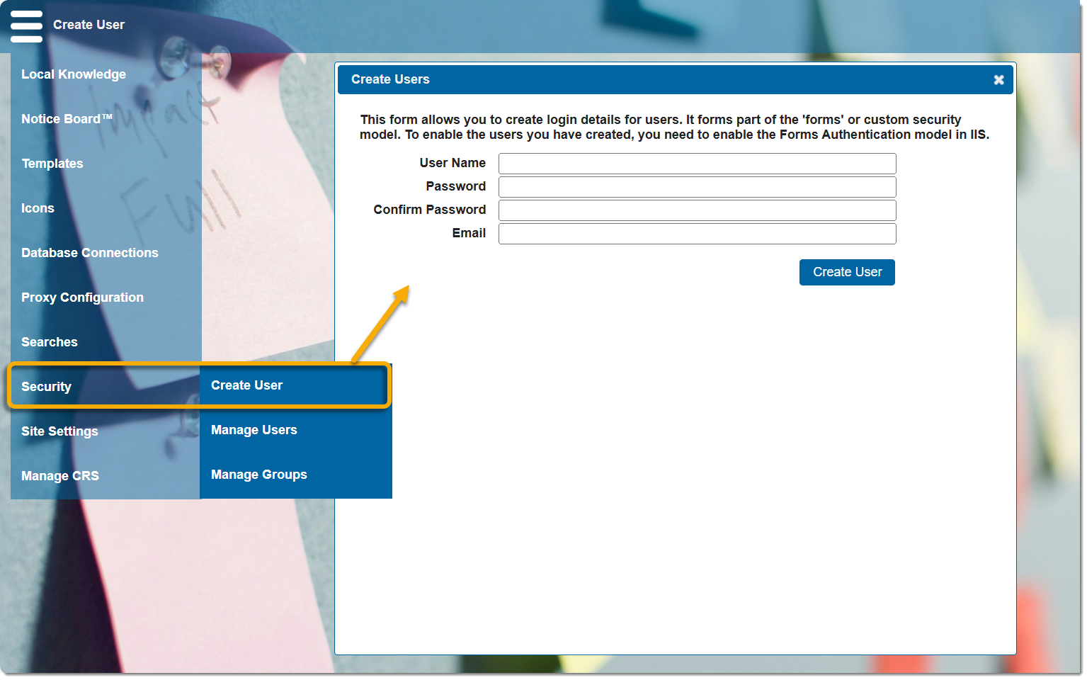 Select Security > Create User from the main drop-down menu and fill the relevant details.
