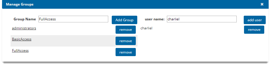 Users can be removed from groups by clicking the remove button next to the user name.