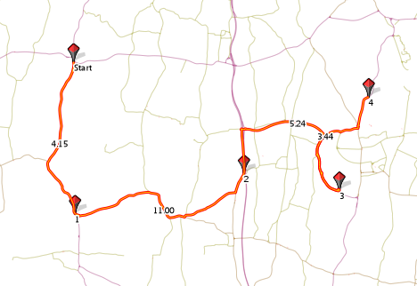 Close route back to starting point: Check this tickbox to create a route that returns to the start point. The above shows a route with Close route back to starting point tickbox unchecked The above shows the same route with Close route back to starting point tickbox checked |