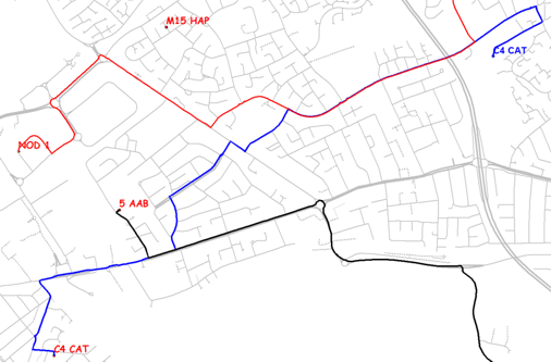 The above example shows two vehicles NOD 1 and C4 CAT; both were taken from similar locations, dumped at similar locations and the two respective shortest routes have common elements.