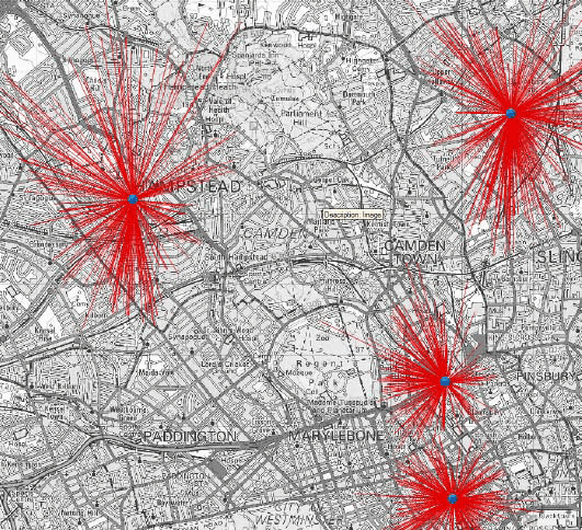 Match Points also has a straight line option, i.e. where the ‘route’ between points with a common attribute is drawn as a straight line. This is useful for Spider Analysis.